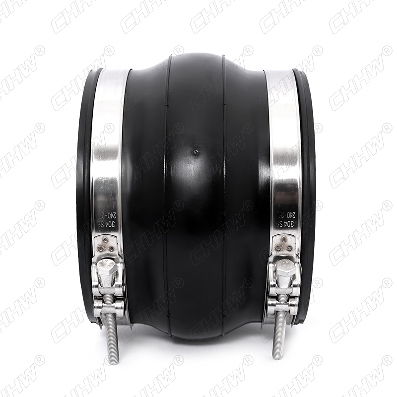 卡箍式可曲撓橡膠接頭采用增強型不銹鋼304抱箍。由織物增強的橡膠件與平形活接頭、松套金屬法蘭或螺紋管法蘭組成,用于管道隔振降噪、補償位移的接頭。它是一種高彈性、高氣密性、耐介質(zhì)性和耐氣候性的管道接頭。按結(jié)構(gòu)分為:單球體、雙球體、彎頭球體。如圖: