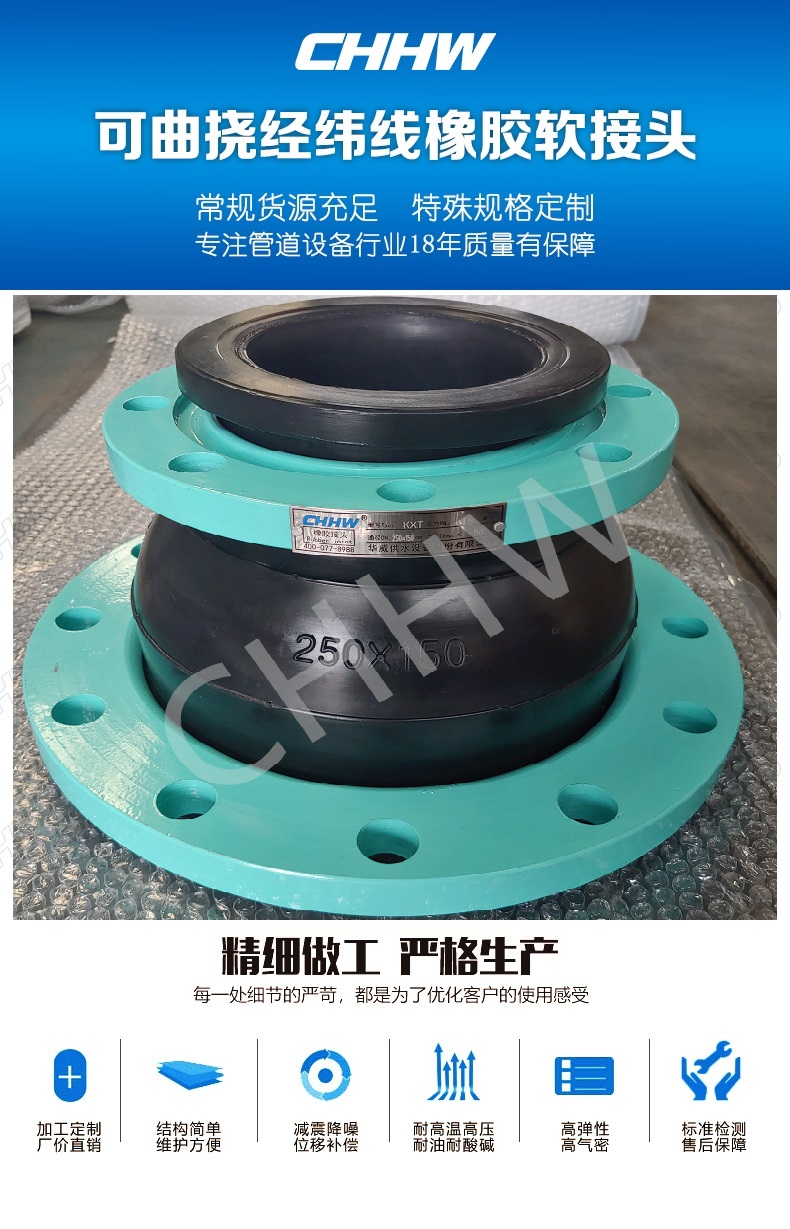 CHHW華威牌可曲撓異徑橡膠軟接頭光澤度高,彈性好,膠質不含再生膠,使用品牌天然橡膠(NR)、氯丁橡膠(CR)、氟橡膠(FKM)、輔料均為國內外知名品牌,球體無異味,使用航空鋼絲銅焊成圈,固定硫化防脫盤能力出眾;耐老化程度是一般球體的5倍;先進的自動成型機成型,纏繞為實心纏繞法,耐高壓,試驗壓力達50公斤,抗橫向拉力是手工成型的3倍;通過日本精度模具,自動硫化機恒溫硫化制成,可以過水、蒸汽、弱酸堿等介質,杜絕球體冒汗現(xiàn)象,球體壽命可達≥5~10年。